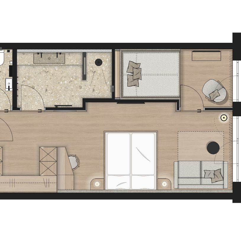 Hard Facts: ca. 45 m² mit Balkon, Holzboden, Bad mit Dusche, Doppelwaschtisch, Föhn, beleuchtetem Kosmetikspiegel und separatem WC, Klimaanlage
